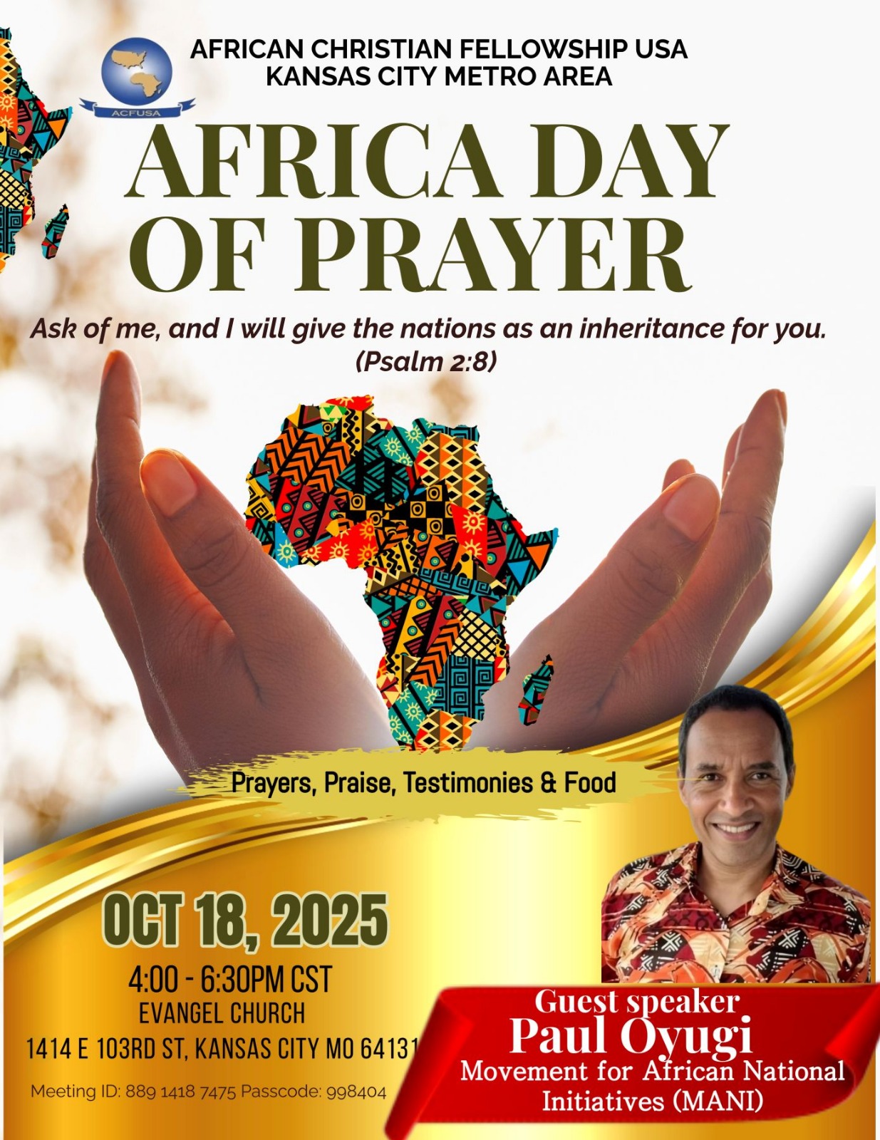 Evangel Church 1414 E 103rd St, Kansas CityJoin us as we pray for Africa and hear updates of various Missions we support in Africa. Featuring Prayers, Praise, Testimonies & Food. Guest speaker: Paul Oyugi from Movement for African National Initiatives (MANI)