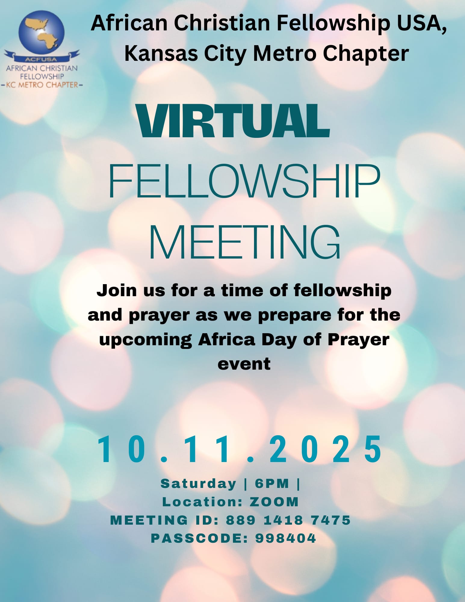ZoomBecause of Africa Day of Prayer on Oct 18, our regular October fellowship will be on Zoom ONLY. Zoom link: acfkc.org/zoom